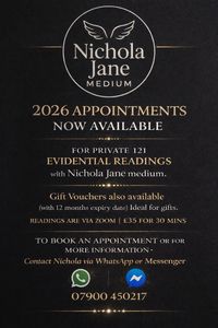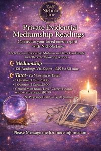 For the last 18 months I have been giving messages off from spirit on different circles as well as most recently branching out to 121 Evidential Readings and Tarot Readings.